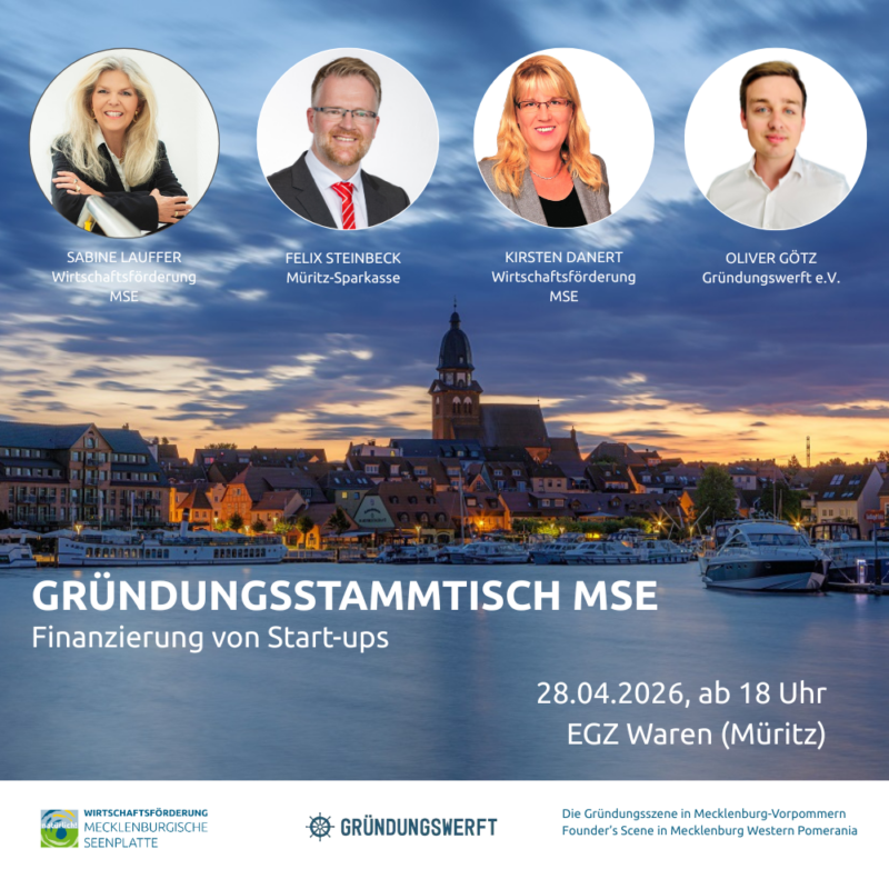 Wer also in MSE gründen möchte oder schon gegründet hat oder sich einfach für die Szene interessiert, diese mitgestalten möchte, ist am 28.04.2026 ab 18 Uhr herzlich willkommen zum Gründungsstammtisch mit dem Schwerpunkt „Finanzierung von Start-ups“.