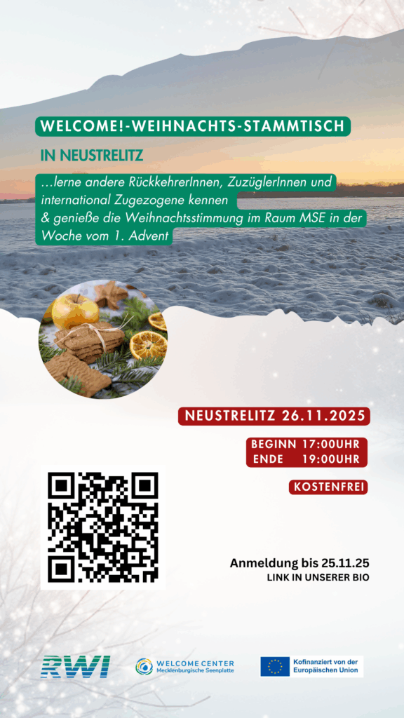 Das Welcome Center MSE lädt alle Rückkehrer, Zugezogene, Neubürger und Interessierte am 26.11.2025 von 17 bis 19 Uhr zu einem Welcome-Weihnachtsstammtisch nach Neustrelitz.