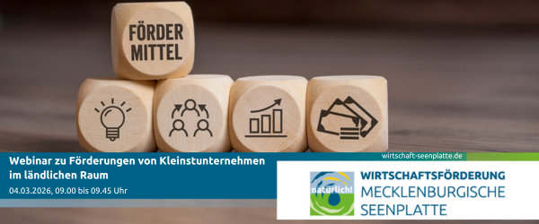 Die Wirtschaftsförderung Mecklenburgische Seenplatte GmbH lädt alle Interessierten am 04.03.2026 von 09.00 bis 09.45 Uhr zu einem kostenlosen Webinar, das den Förderaufruf vorstellt, den digitalen Antragsprozess erklärt und an praktischen Beispielen nachvollziehbar macht